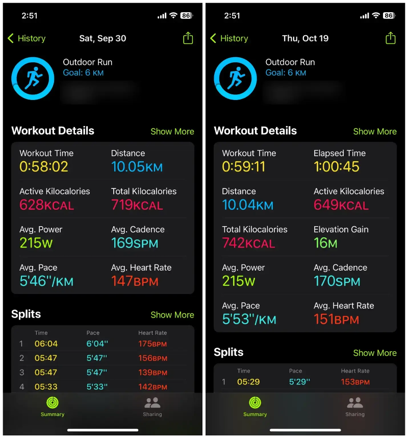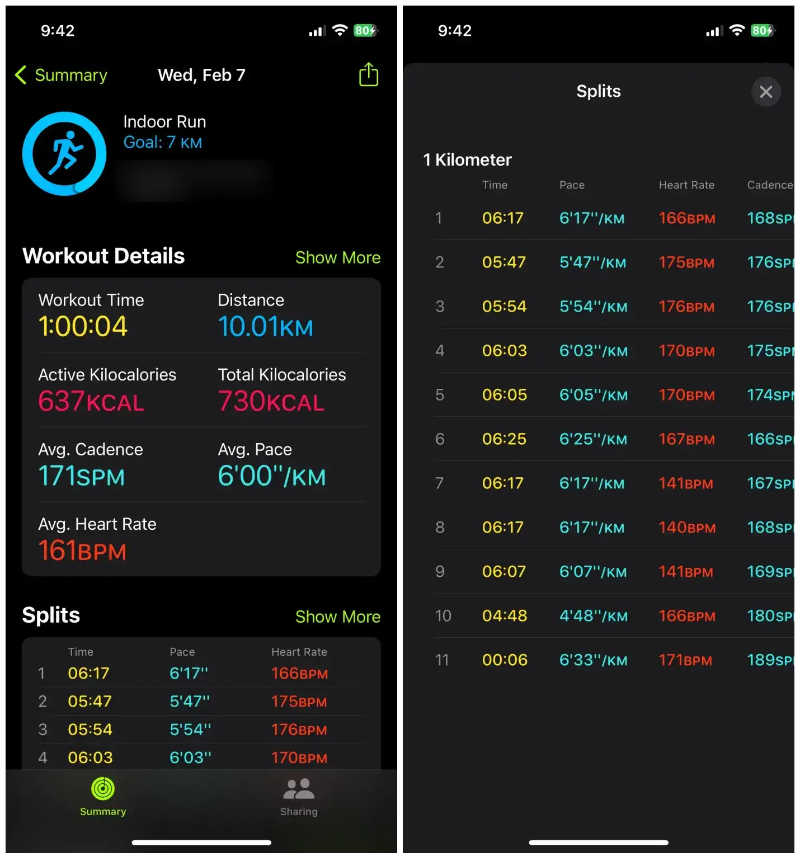 트레드밀에서 달릴 때 염두에 둬야 할 것은, 트레드밀과 애플워치 간 데이터 차이가 존재한다는 점이다. 두 기기 간 속도와 거리 데이터 차이를 뛰어넘어 애플워치 기준 60분 내 10km 조깅을 달성하기 위해서는 트레드밀 속도를 10km/h보다 높일 필요가 있다. (트레드밀 속도를 10km/h에 맞춰놓을 때 애플워치 스플릿이 정확히 6'00"/km이 되는 것이 아니다.)