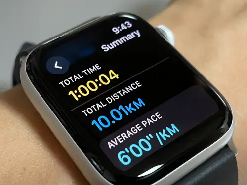 애플워치에서 10.01km에 도달했을 때 얼른 운동 종료 버튼을 눌렀으나 스톱워치가 이미 60분 4초(1:00:04)를 가리켰다. 간발의 차였다.